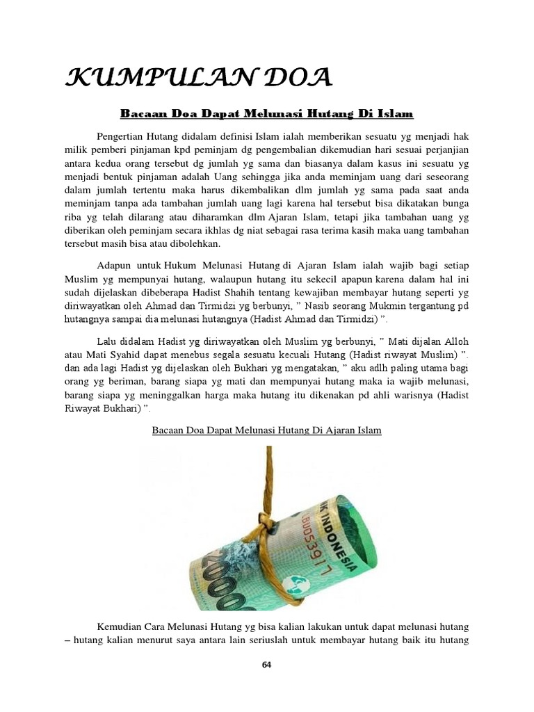 Meski berawal manis namun seorang yang sudah terikat hutang tidak akan bisa hidup bebas dan terus terbayang hutangnya. Doa cepat kaya dan lunas hutang paling mustajab. Setelah anda mengetahui doa serta dzikir pelunas hutang diatas, anda perlu mengamalkannya dengan benar. Doa mustajab melancarkan rezeki dan melunasi hutang hingga sebesar gunung emas; Doa lunas hutang ini adalah doa agar bisa bayar hutang (jika anda memiliki hutang), atau doa agar terbebas dari hutang (dapat.
